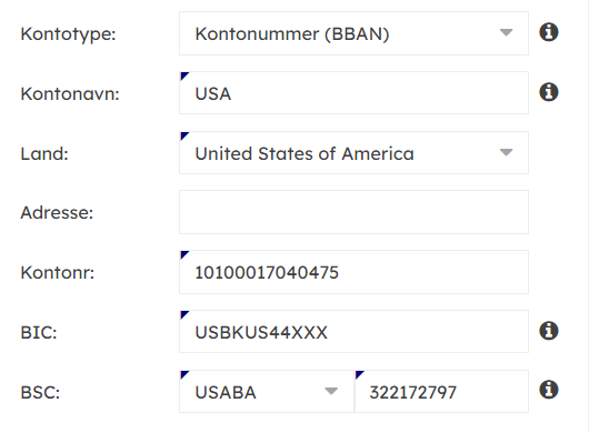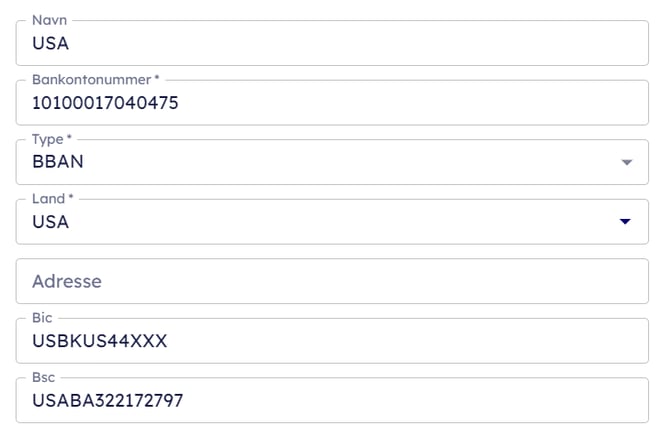 USA: I tillegg til kontonummer (her velger man BBAN som type, ikke IBAN) trenger man også BIC/Swift og Fedwire eller ABA-nummer. Bankinformasjonen for en betaling til USA bør se slik ut i systemet: