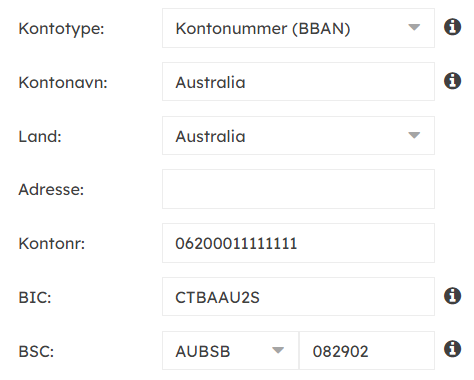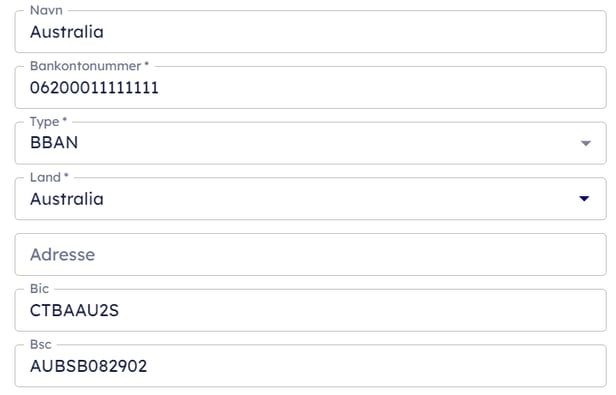 Australia og Sør-Afrika: I tillegg til mottakers konto må du oppgi både BIC og nasjonal bankkode. Bankinformasjonen for en betaling til disse landene bør se slik ut i systemet.