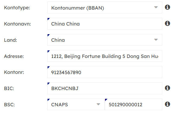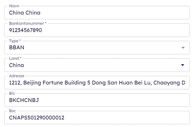 Kina: I tillegg til mottakers konto og adresse må du oppgi både BIC og nasjonal bankkode (CNAPS). CNAPS kode brukes kun hvis man betaler i CNY valuta. Bankinformasjonen for en betaling til Kina bør se slik ut i systemet: