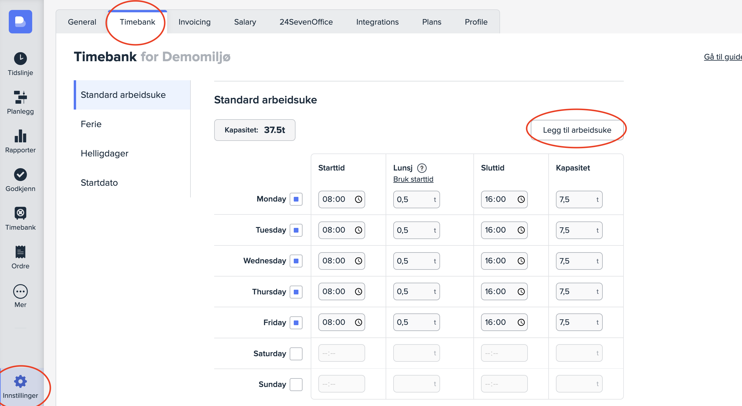For å opprette en egen arbeidsuke for selskapet går du til «Innstillinger» -> «Timebank» og trykker på «Legg til arbeidsuke».