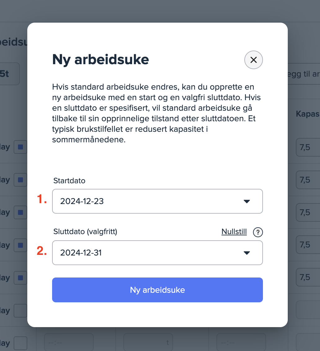 For å opprette en ny arbeidsuke for selskapet må du velge en startdato (1) og sluttdato (valgfritt) (2). I vinduet under har jeg tatt som eksempel at selskapet ønsker å lage en egen arbeidsuke for julen 2023, fra 20.12.2023 til 31.12.2023.