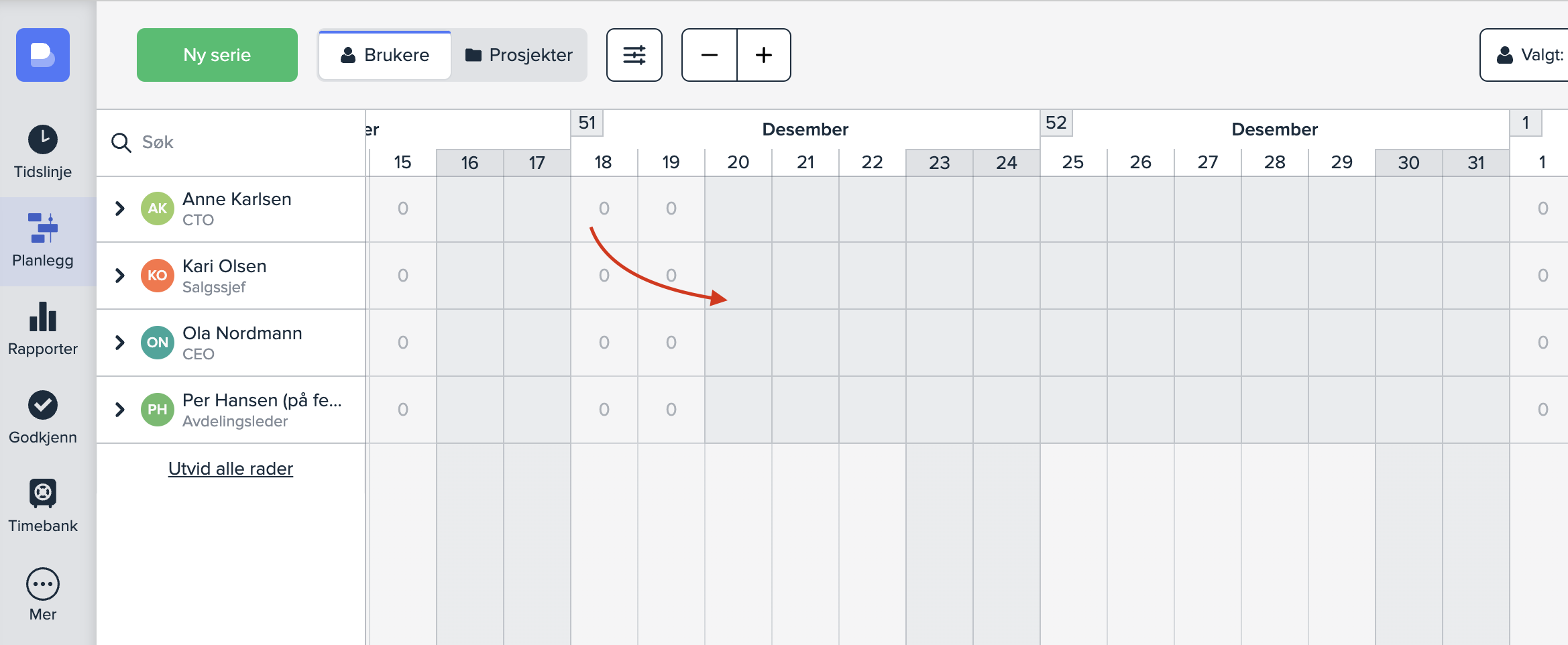 Obs: Dersom noen ansatte allerede har egendefinerte arbeidsuker og ikke bruker selskapets arbeidsuker, må man opprette egne arbeidsuker for disse. Du kan lese om hvordan i vår artikkel om håndtering av permisjon, deltid og langtidsfravær for ansatte.