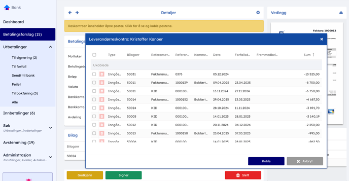 - Når postene er koblet vil de legge seg samlet i bankmodulen og det vil se slik ut på betalingsdetaljene.