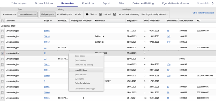 - Der kobler du sammen de postene som skal kobles, deretter høyreklikker du på en og en og velger legg til i bank.