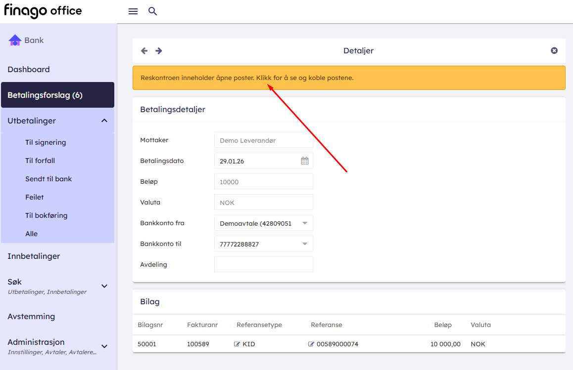 - I bank kommer det opp et gult varsel på betalingen hvis leverandør har åpne poster som kan kobles i reskontro. Hvis du trykker på dette varselet vil du komme til et vindu hvor du kan koble poster.