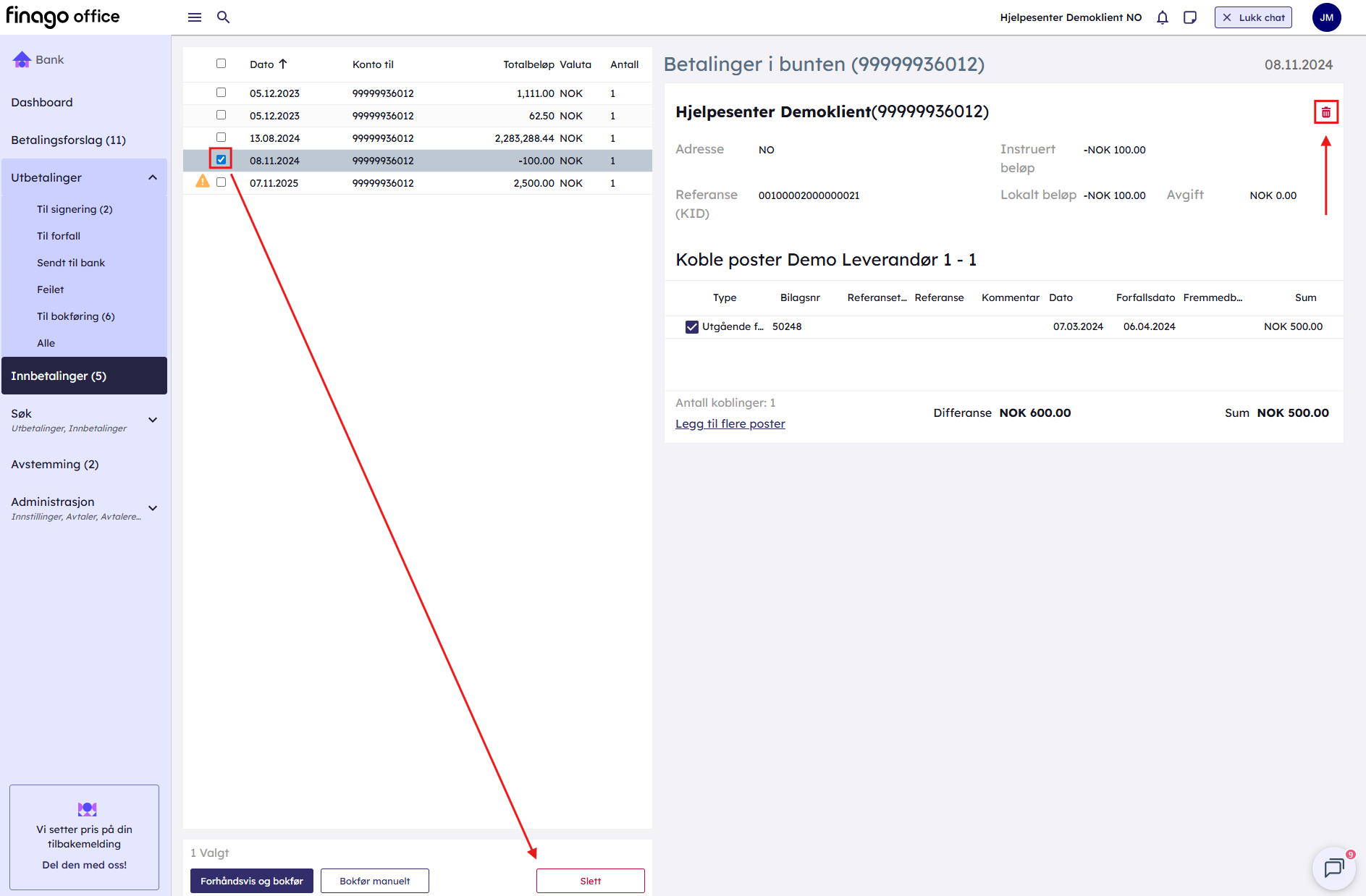 Åpne bunten for å vise tilhørende innbetalinger i høyre panel. Her kan du slette enkeltbetalinger ved å klikke på søppelikonet. Merk at betalinger i en bunt må slettes én og én.