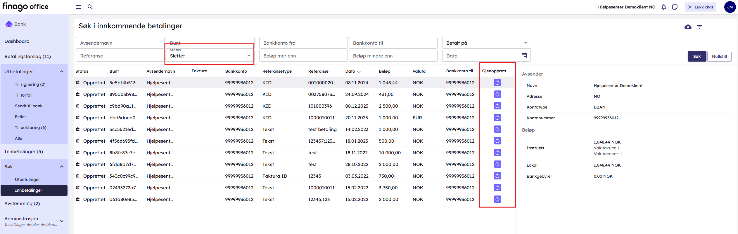 Gå til Søk, velg status Slettet, og klikk på Gjenopprett på den aktuelle betalingen. Betalingen legges da tilbake i innbetalingslisten.