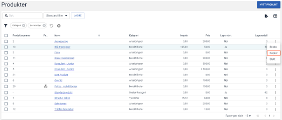 - Klikk på de tre prikkene ved produktet du ønsker å kopiere og velger kopier.