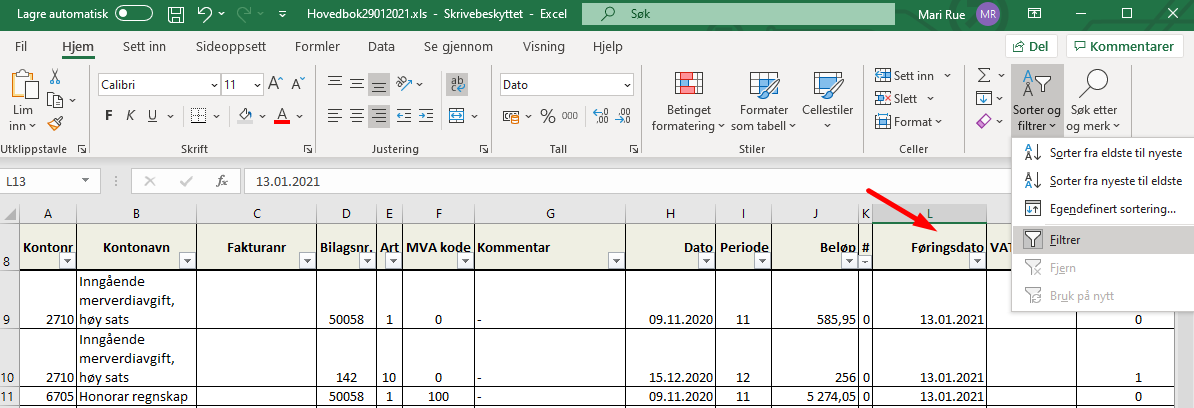 - Legg filter på overskriftslinjen. Sorter kolonnen bokføringsdato fra nyest til eldst. Da ser du raskt om det er bokført bilag etter at tilleggsposter/årsoppgjørsposter ble bokført. Isåfall må du reversere disse bilagene og bokføre dem 01.01. året etter. Alternativet er å endre på årsoppgjøret, noe som sjelden er aktuelt.