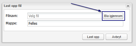 Du får da opp et dialogvindu, klikk på Bla gjennom og du kommer inn i dine dokumenter. Her kan du også dobbeltsjekke hvor filen vil bli lastet opp i feltet Mappe.