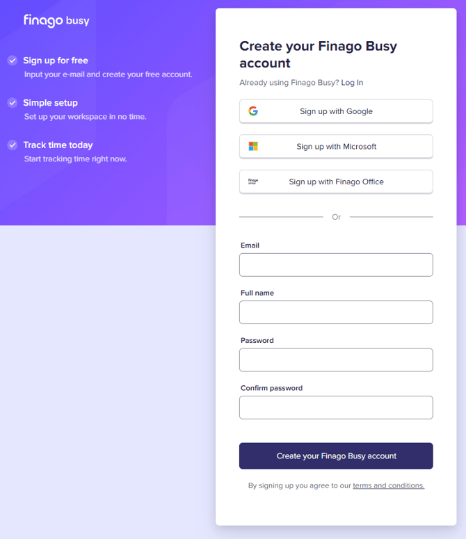 Dersom du ønsker å opprette en bruker i Busy uten å ha fått invitasjon på forhånd klikker du her for å komme til vår registreringsside. På denne siden kan du velge om du vil registrere deg med Google, Finago Office eller annen e-post.