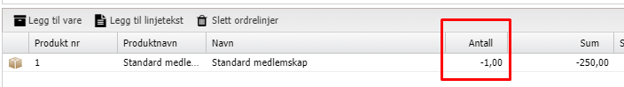 Her åpnes ordrebehandling med valgt faktura. Ordrestatus viser kreditèr, og antall varer og priser vises med minus foran. - Velg "lagre" eller "fakturer" for å opprette kreditnota.