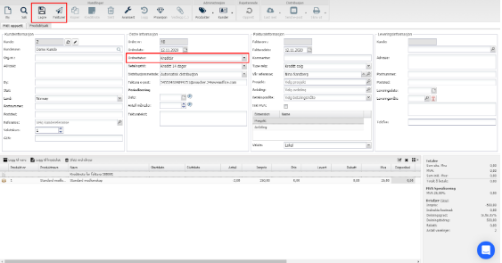 - Velg "fakturer". Ordrestatus endres automatisk til "Kreditert".