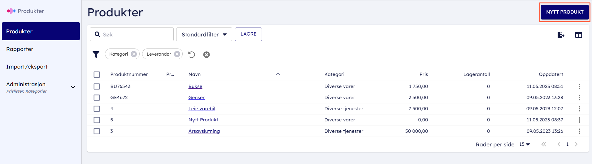 For å opprette nytt produkt må du klikke på knappen >nytt produkt> øverst til høyre.