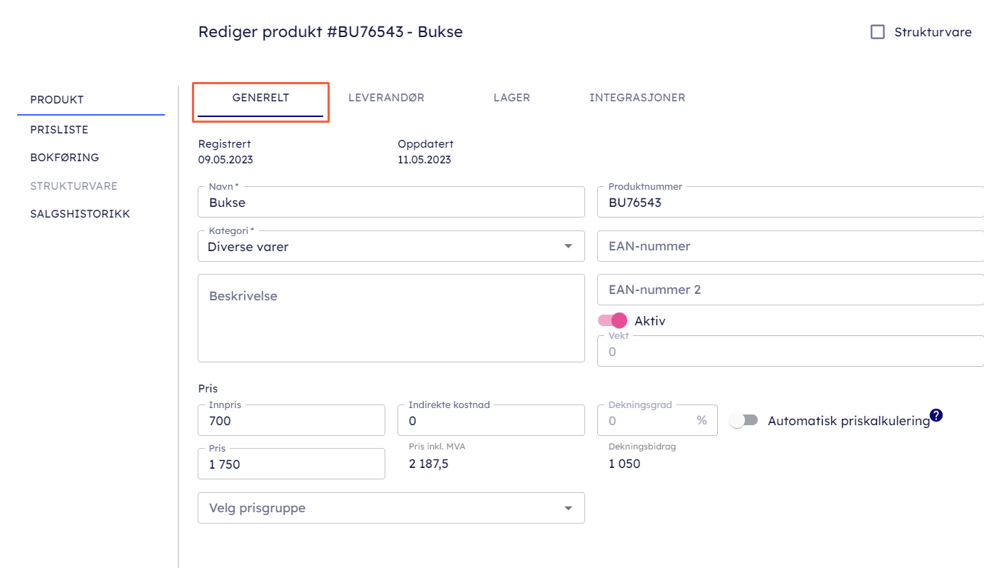 Fanene generelt legger du inn informasjon om produktet som navn, kategori, priser, produktnummer, om produktet er aktivt.