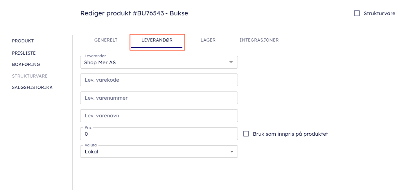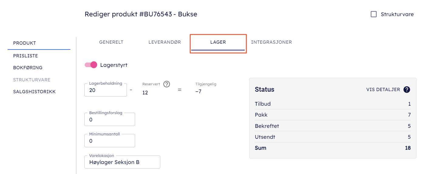 Her legger du inn lagerinformasjonen, om produktet skal lagerføres