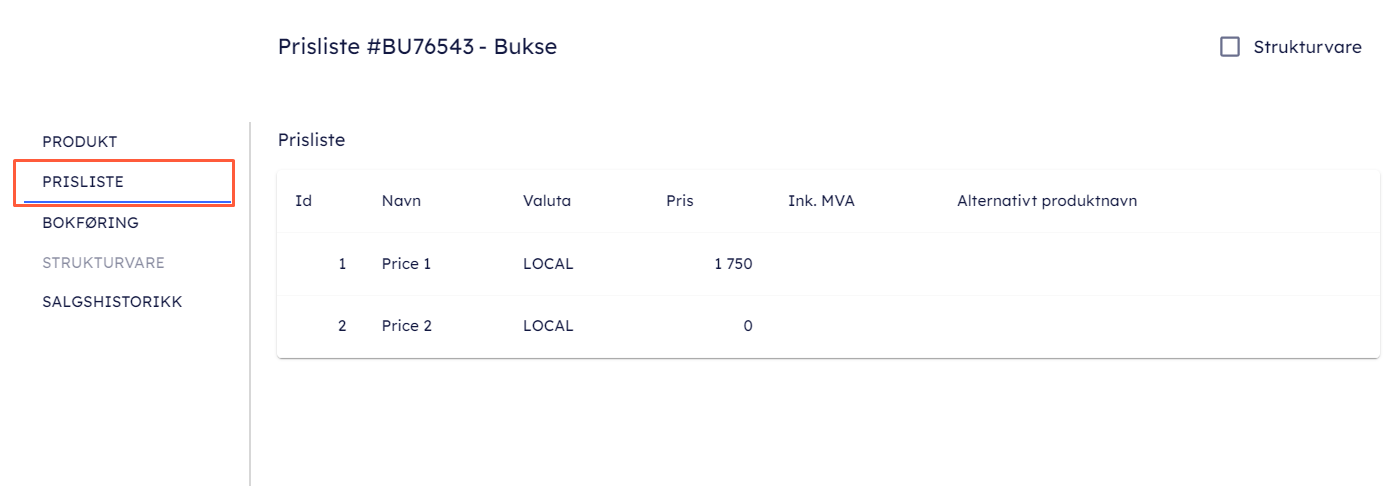 For å kunne gå inn på fanene prisliste og konto må produktet lagres først.