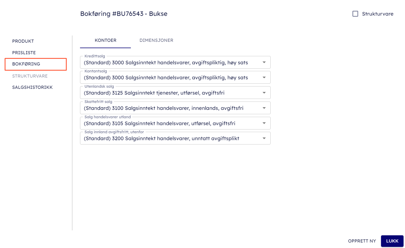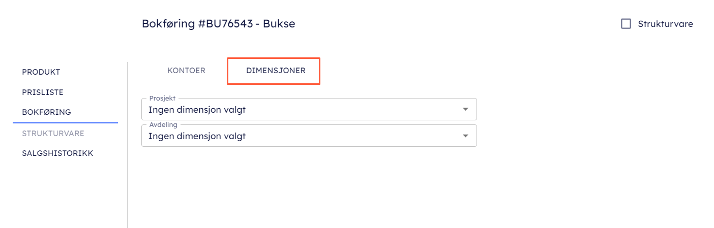 Du har også her mulighet til å legge til dimensjoner. Dimensjonene vil automatisk legges til på fakturaer hvor produktet blir lagt til.