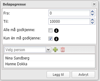 Velg mellom at alle må godkjenne, da må alle personene som legges til her godkjenne faktura, eller minst en må godkjenne, da holder det at en person i listen godkjenner.