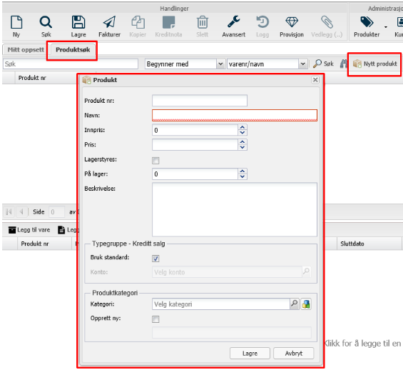 - Produktnummer: dette velger neste ledige produktnummer og behøver ikke fylles ut.