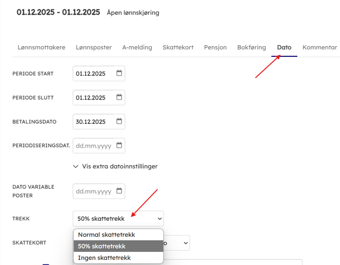 • NB: Dersom du allerede har en åpen lønnskjøring det skal være halv skatt på kan du gå inn på lønnskjøringen -> fanen "Dato" og endre skattetrekk der.