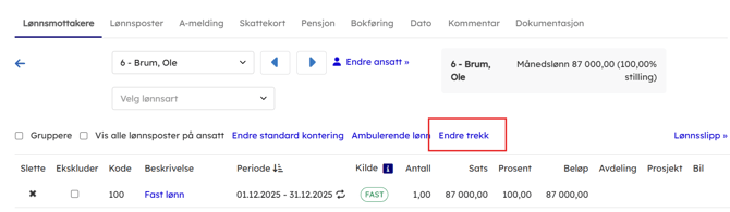 For å endre dette kan man trykke seg inn på lønnsposten med prosenttrekk. Du vil da få opp et eget felt som heter trekk og her kan du overstyre.