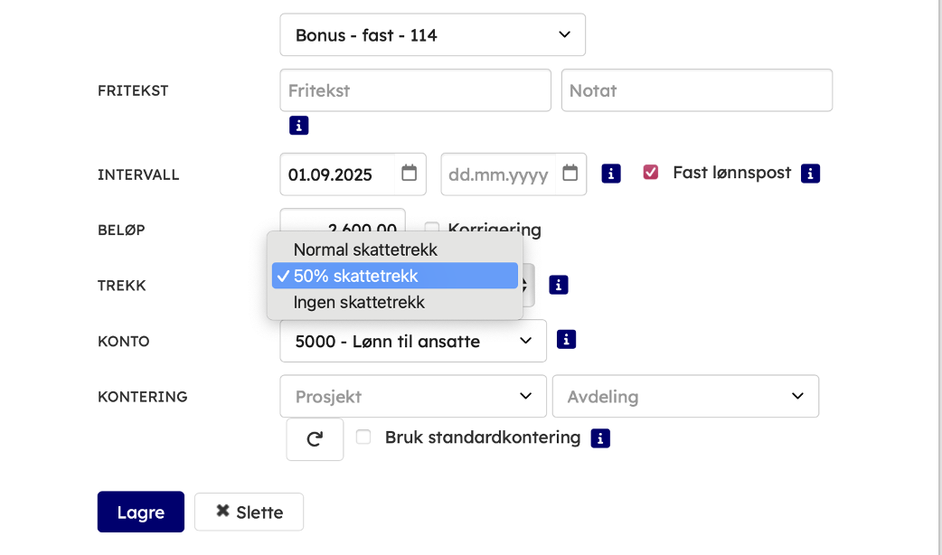 • Det vil da automatisk beregnes 50% skattetrekk på alle ansatte i inneværende lønnskjøring.
