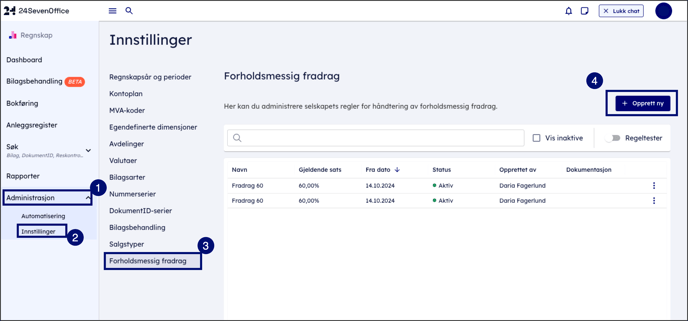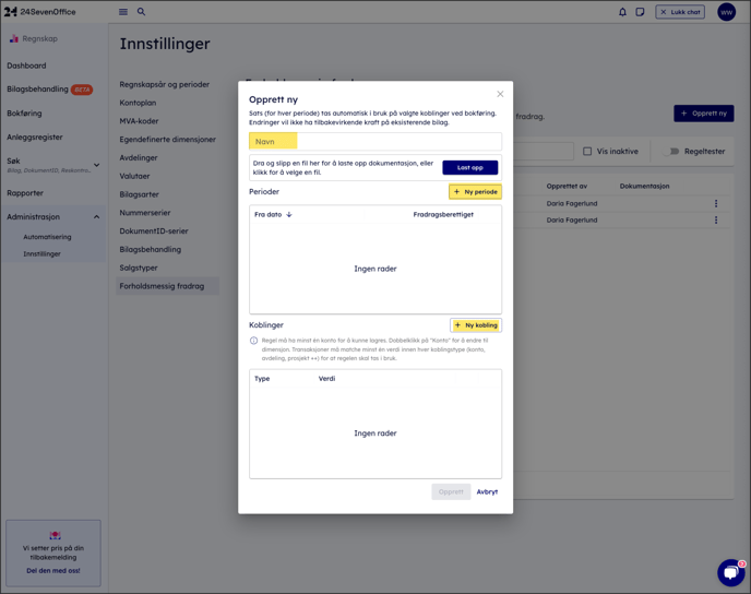 Her finner du svar på hvordan du går frem for å opprette en ny regel for forholdsmessig fradrag i bilagsbehandlingen.