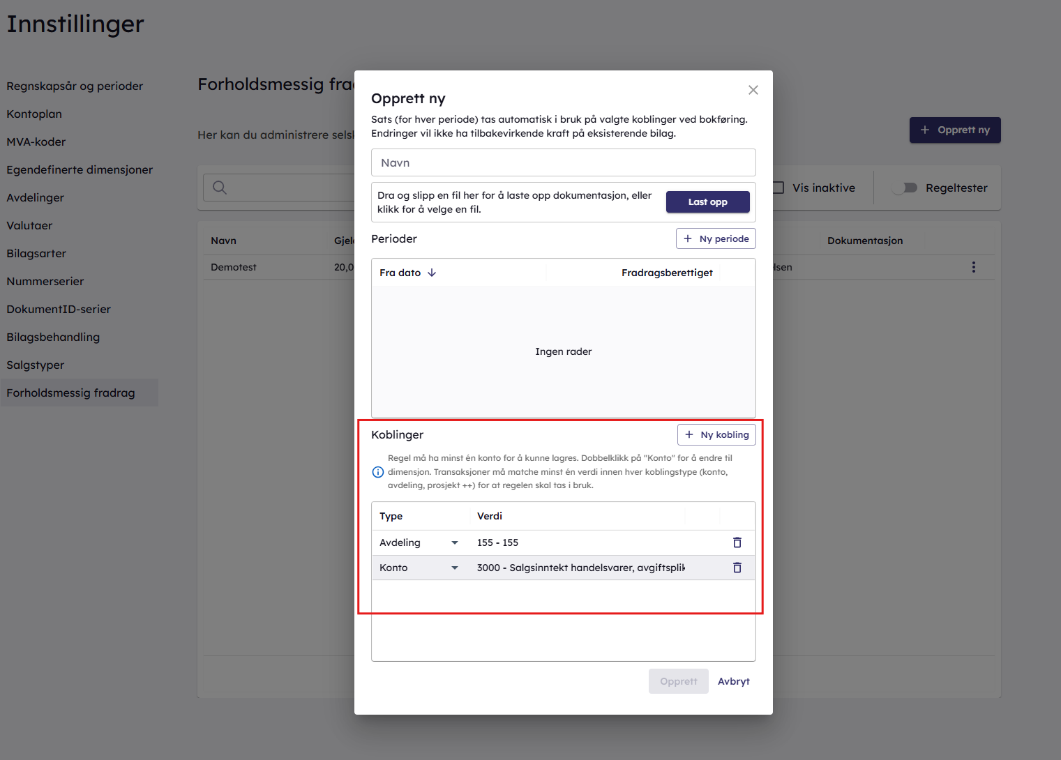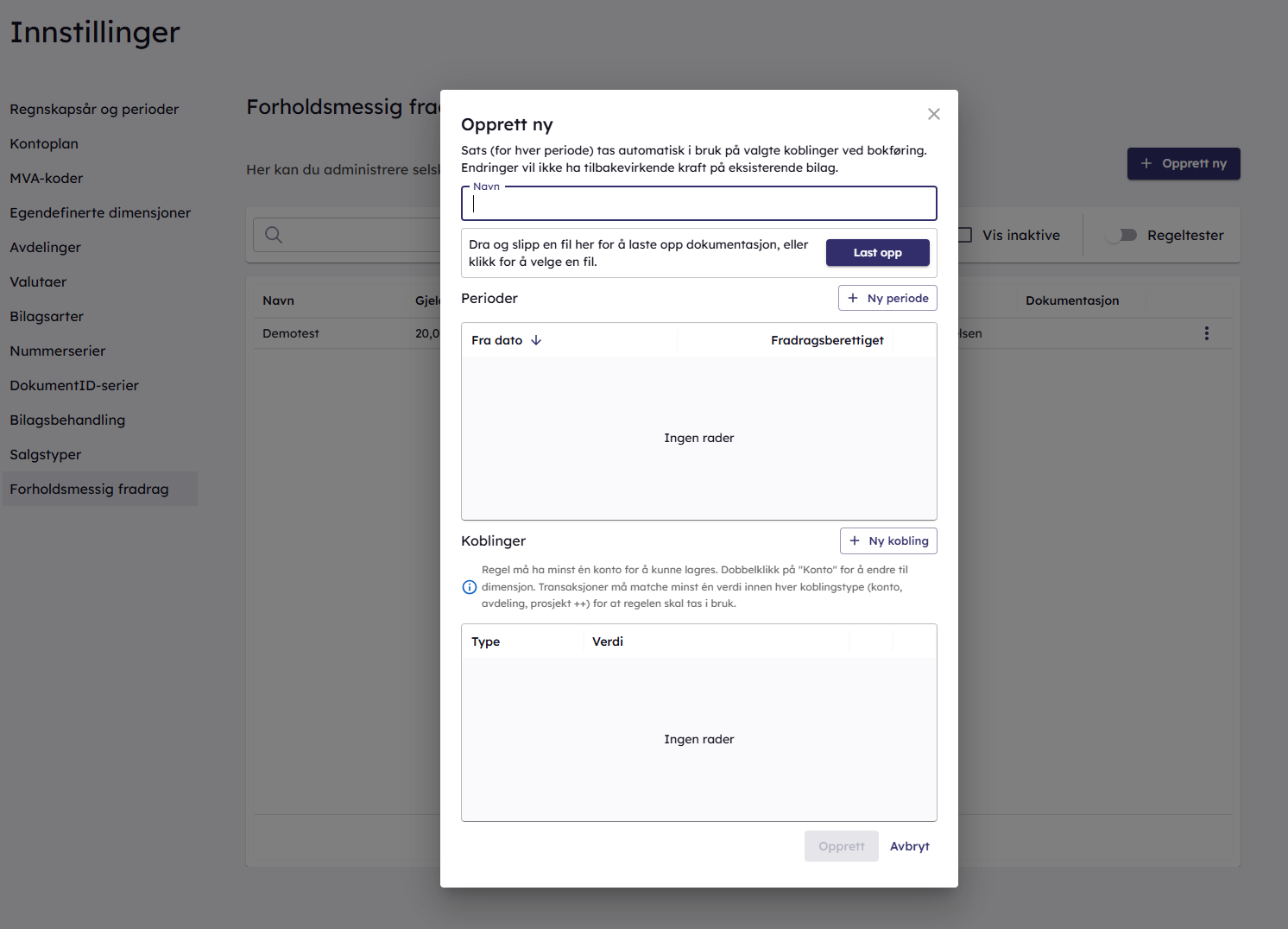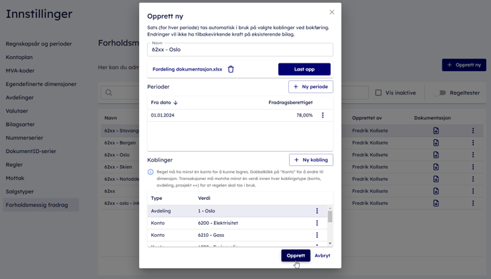 Hvordan oppretter jeg en regel for forholdsmessig fradrag i bilagsbehandling?