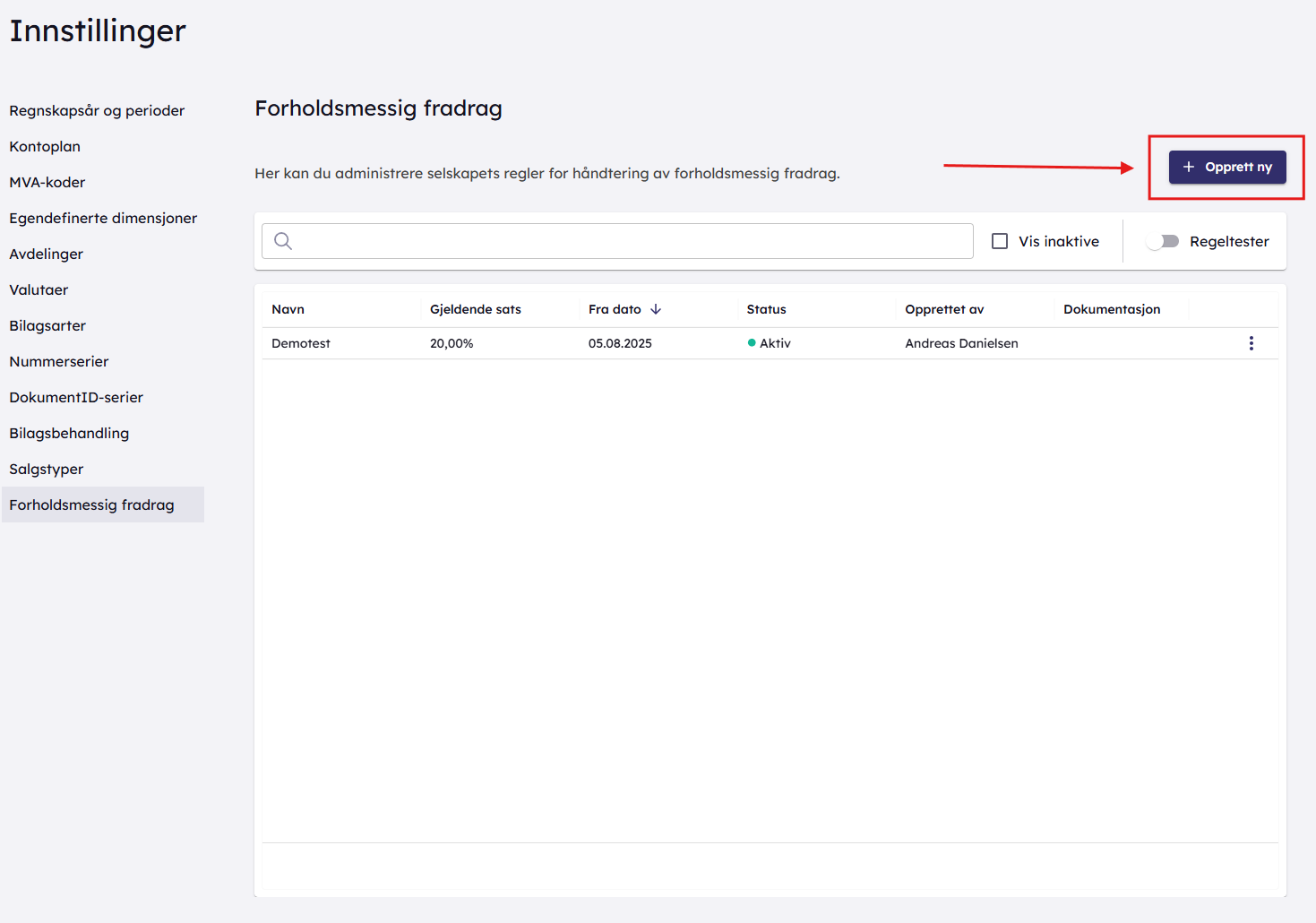 - Gå til Regnskap → Administrasjon → Innstillinger → Forholdsmessig fradrag.