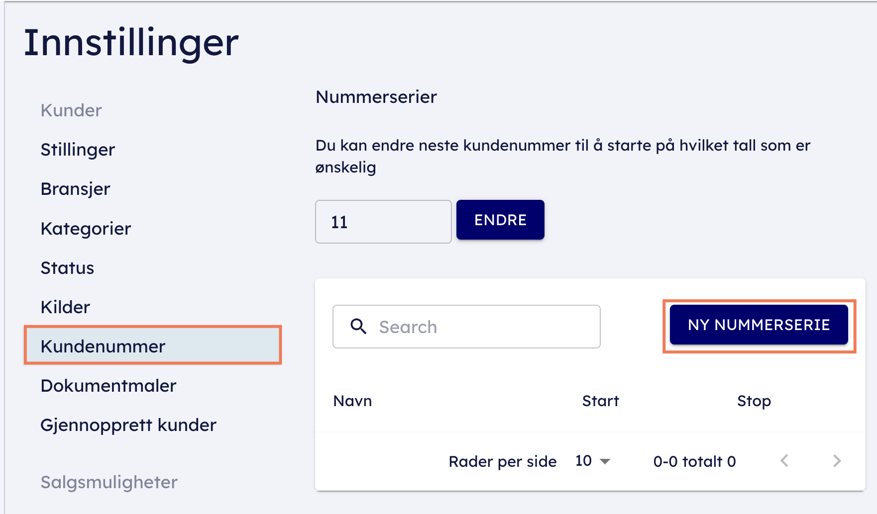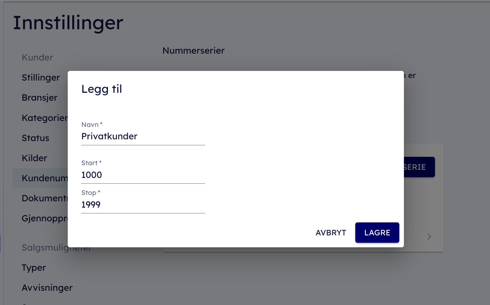 2. I vinduet som kommer opp fyller du inn egendefinert navn på nummerserien, og hvilket kundenummer serien skal starte, og slutte på.