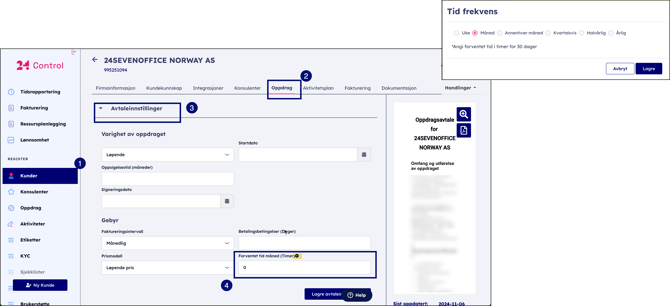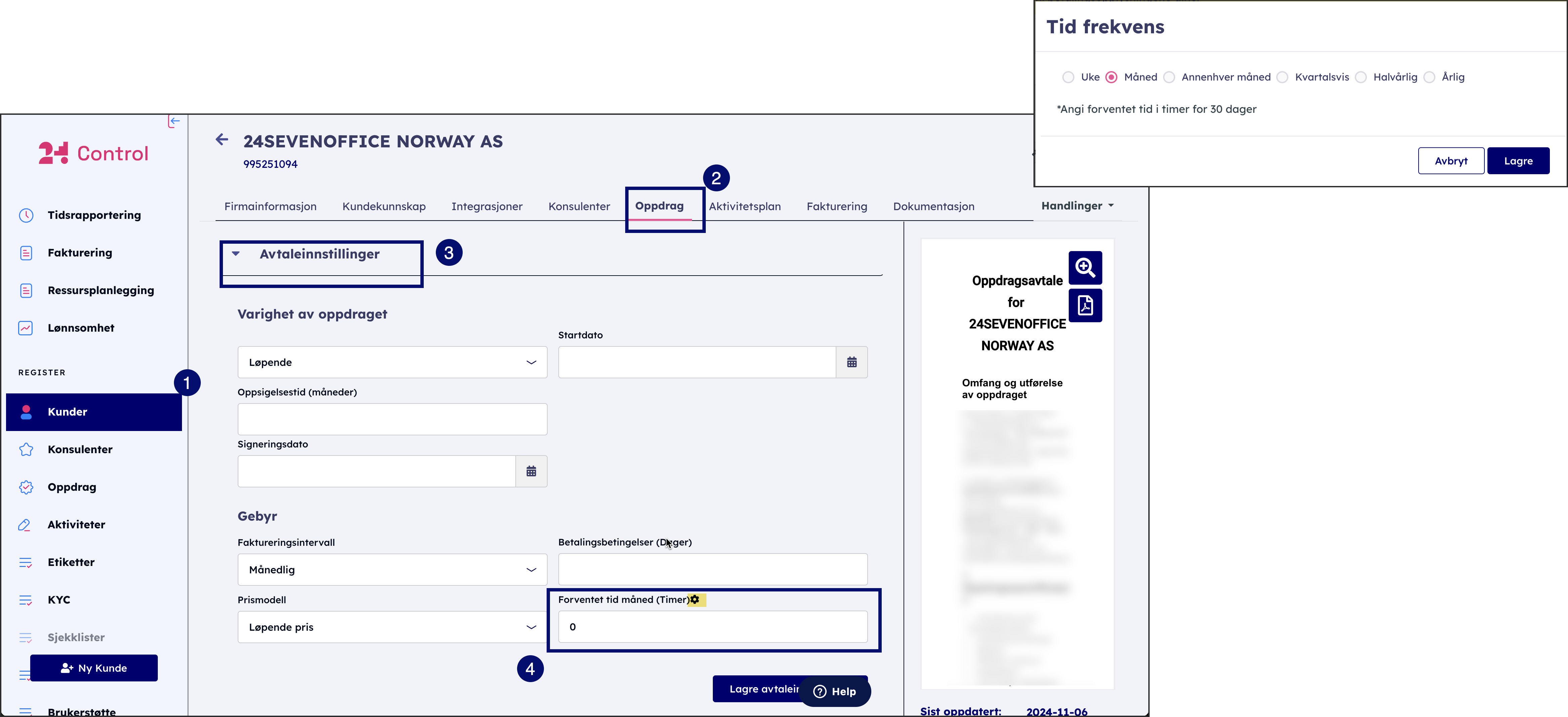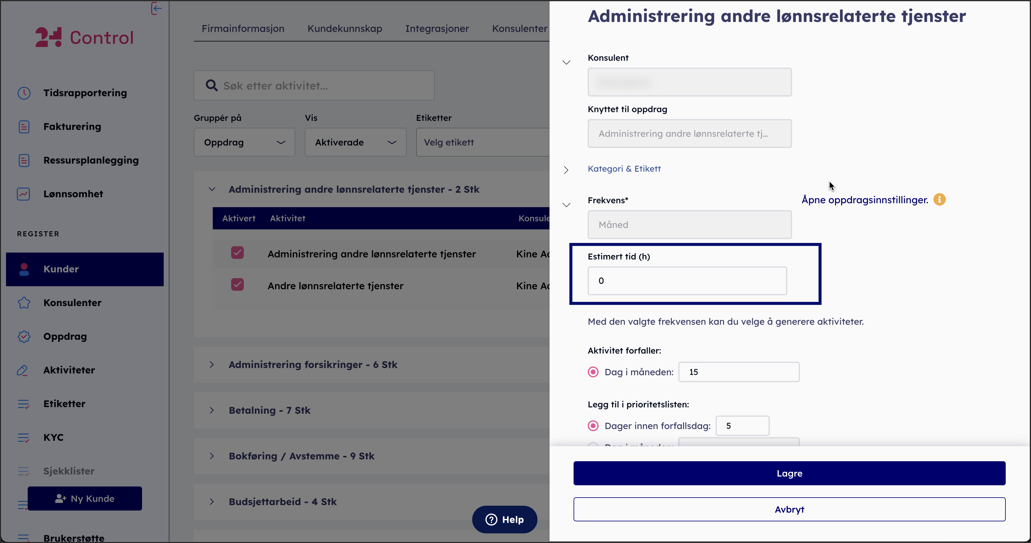 I feltet Estimert tid angir regnskapsføreren hvor lang tid oppdraget er forventet å ta for valgt intervall (måned, år, uke, osv.).