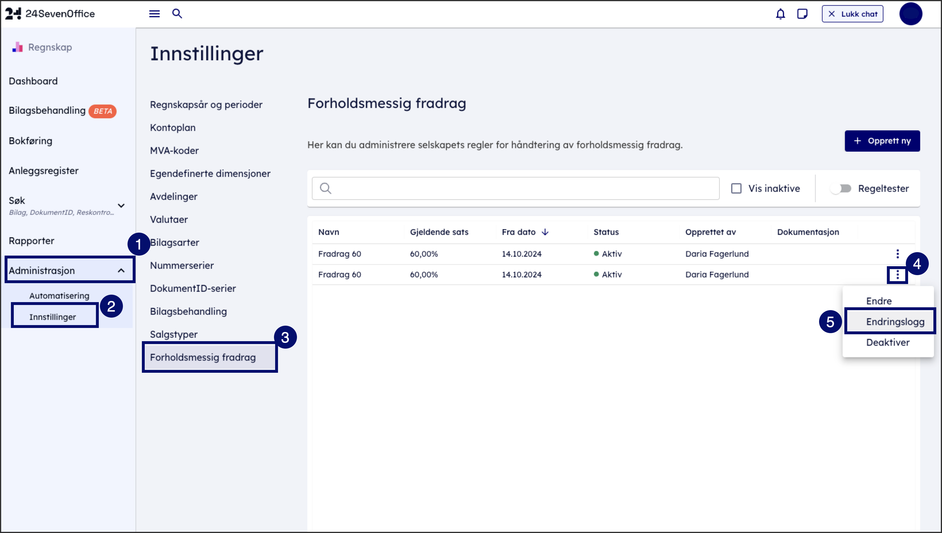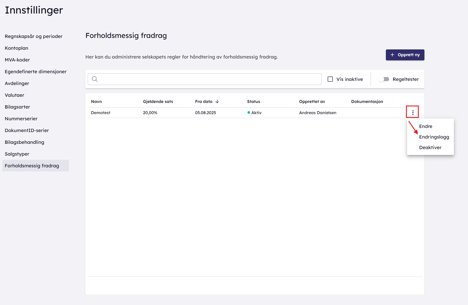 Her beskriver vi hvordan du ser endringsloggen for en regel for forholdsmessig fradrag som er satt opp i regnskapsinnstillinger.