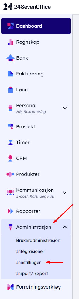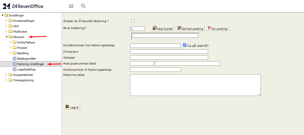 - Innstillinger for Factoring finner du ved å gå til Administrasjon – Innstillinger