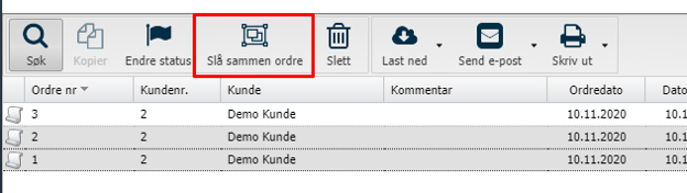 - Her merker du ordrene du ønsker å slå sammen, og trykker på "Slå sammen ordre".