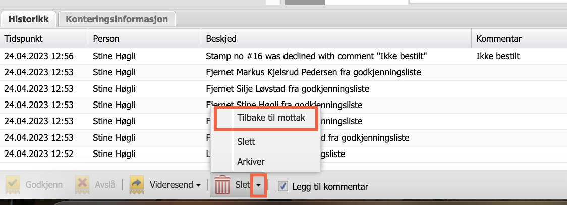 For å slette et dokument eller sende det tilbake til mottaket har du to muligheter. Du kan sende det tilbake til mottak via bokføring eller godkjenning.