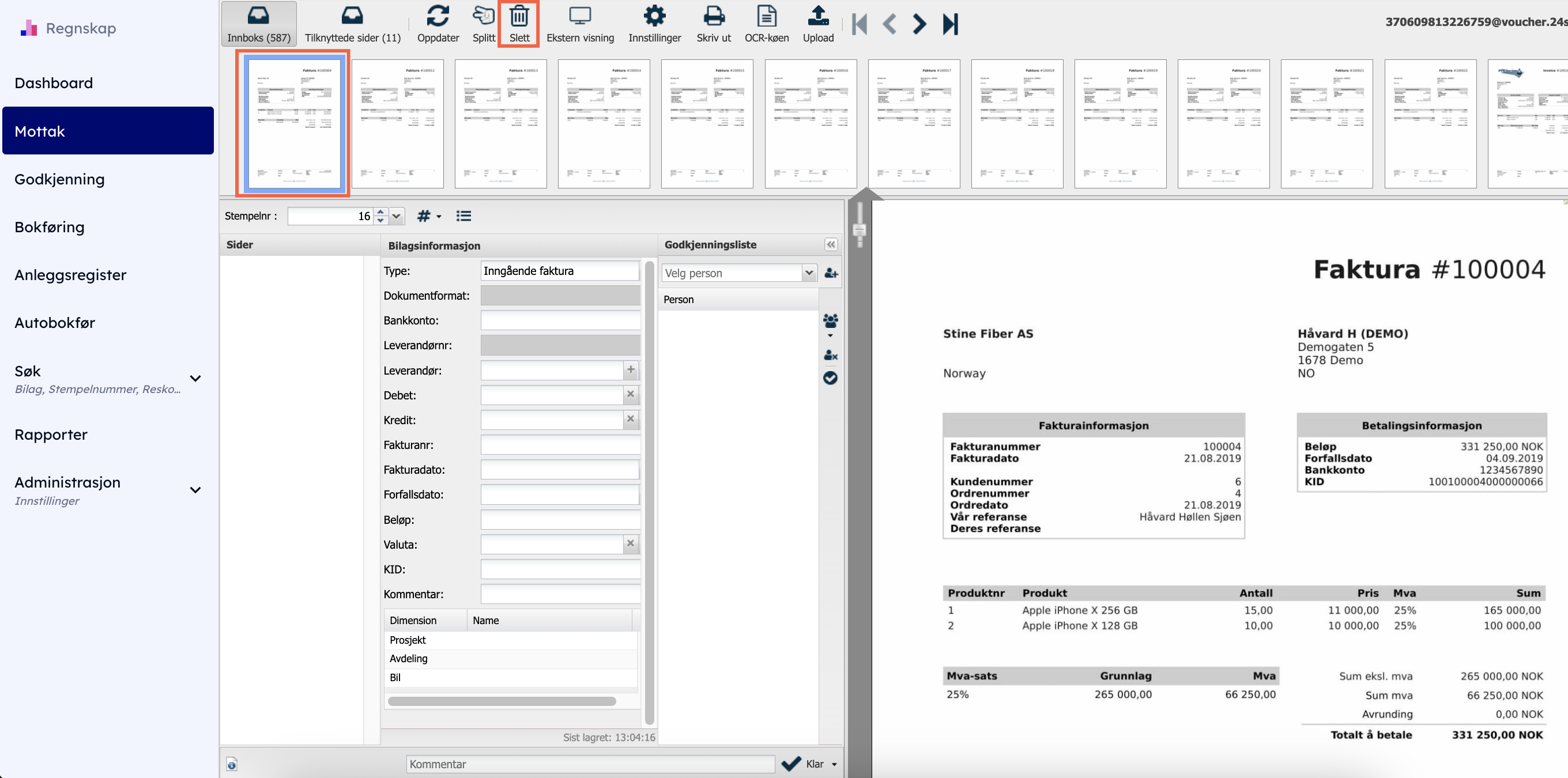 Nå går du til mottaket i menyen på venstre side og velger tilknyttede sider i menyen på toppen av mottaket. Her drar du dokumentet ned til sider og klikker det bort på det røde krysset på fakturaen.