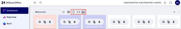 Det å tilpasse dashboardet til mobil kan være nyttig for brukere som trenger å ha tilgang til viktige funksjoner mens de er på farten. Ved å tilpasse dashbordet til mobil- eller nettbrettsvisning, vil du ha en rask og enkel tilgang til 24SevenOffice uansett hvor du befinner deg. Det kan gjøres ved å gå inn i redigeringsbilde på dashboardet du ønsker å se og trykke på enten “mobil” eller “tablet” slik illustrert nedenfor.