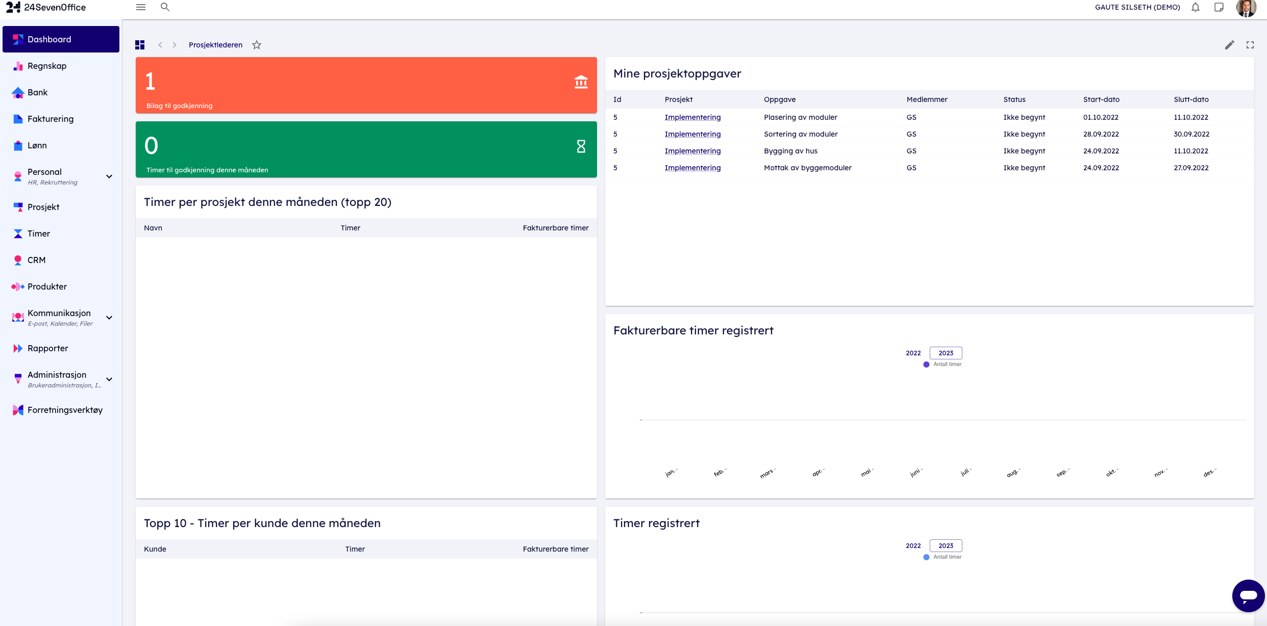 En prosjektleder setter det å beholde oversikten over alle faser i et prosjekt, fra planlegging til økonomi, høyt. I dette dashboardet har vi blant annet inkludert widgets som viser «fakturert totalt», bilag til godkjenning, faktureringsgrad, prosjektoppgaver og antall fakturerbare timer.