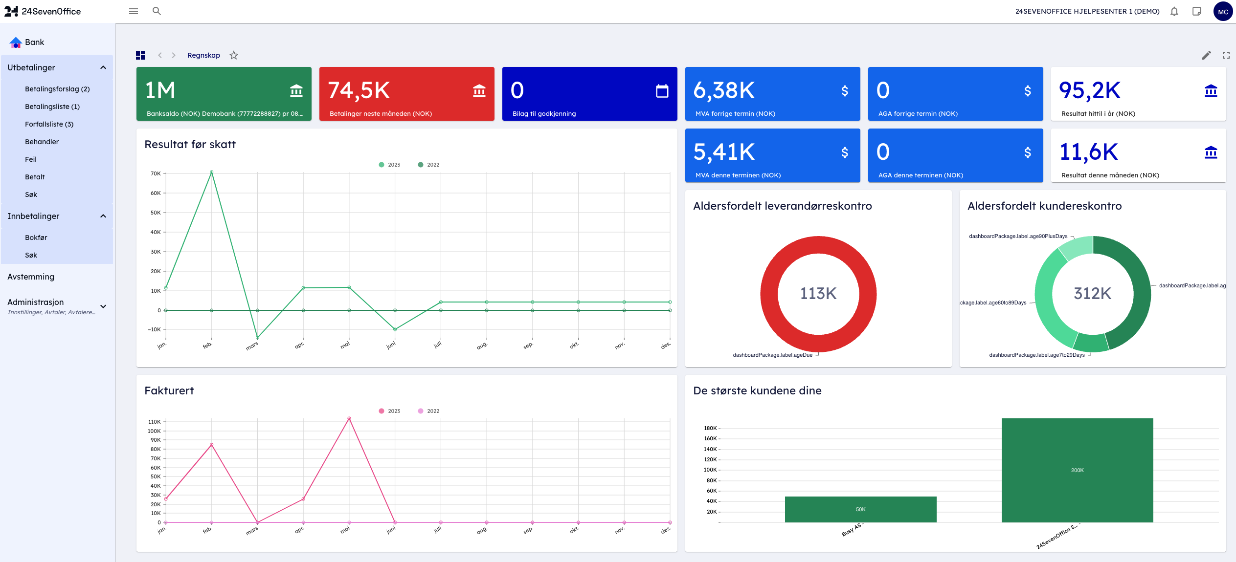 - Banksaldo: Viser saldoen på selskapets bankkontoer i sanntid.