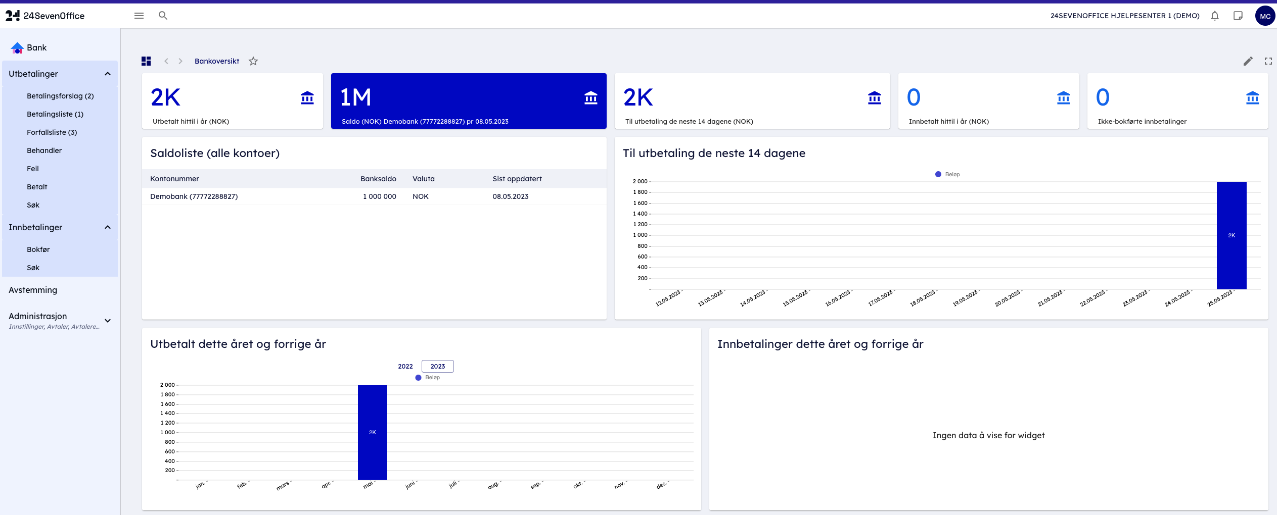 Inne i Bank-modulen har du muligheten til å designe ditt eget tilpassede dashbord. Her er det er også mulig å inkludere widgets fra andre moduler, som for eksempel fakturering og regnskap, for å samle all relevant informasjon på ett sted. Widgetene vi har benyttet i dette eksempelet er: Saldo, Utbetalinger for de neste 14 dagene, Utbetalt fra bank-modulen hittil i år og Innbetalt hittil i år. Å opprette et tilpasset dashboard i bankmodulen kan gi en unik innsikt i din økonomiske situasjon, på en oversiktlig måte.