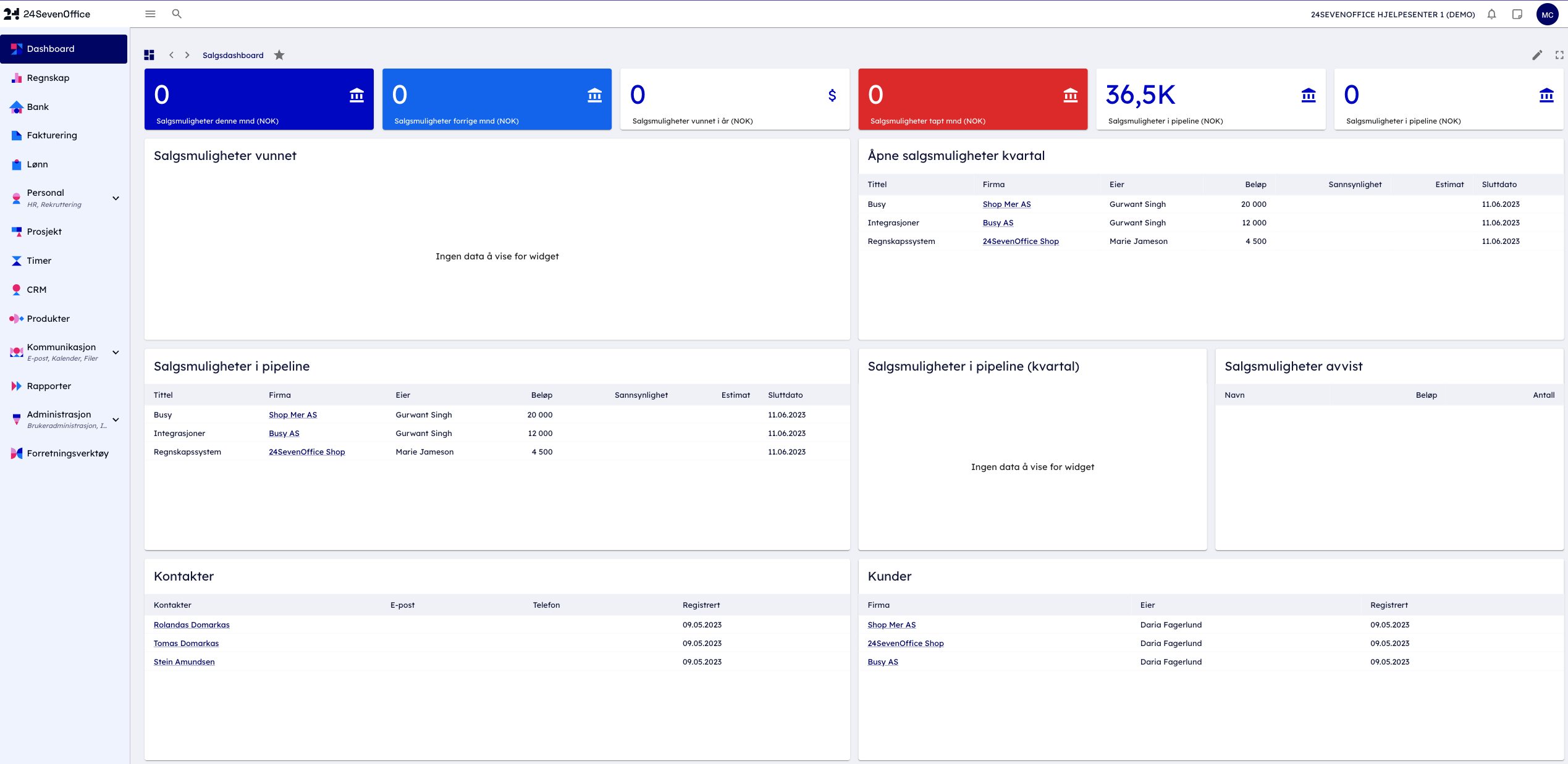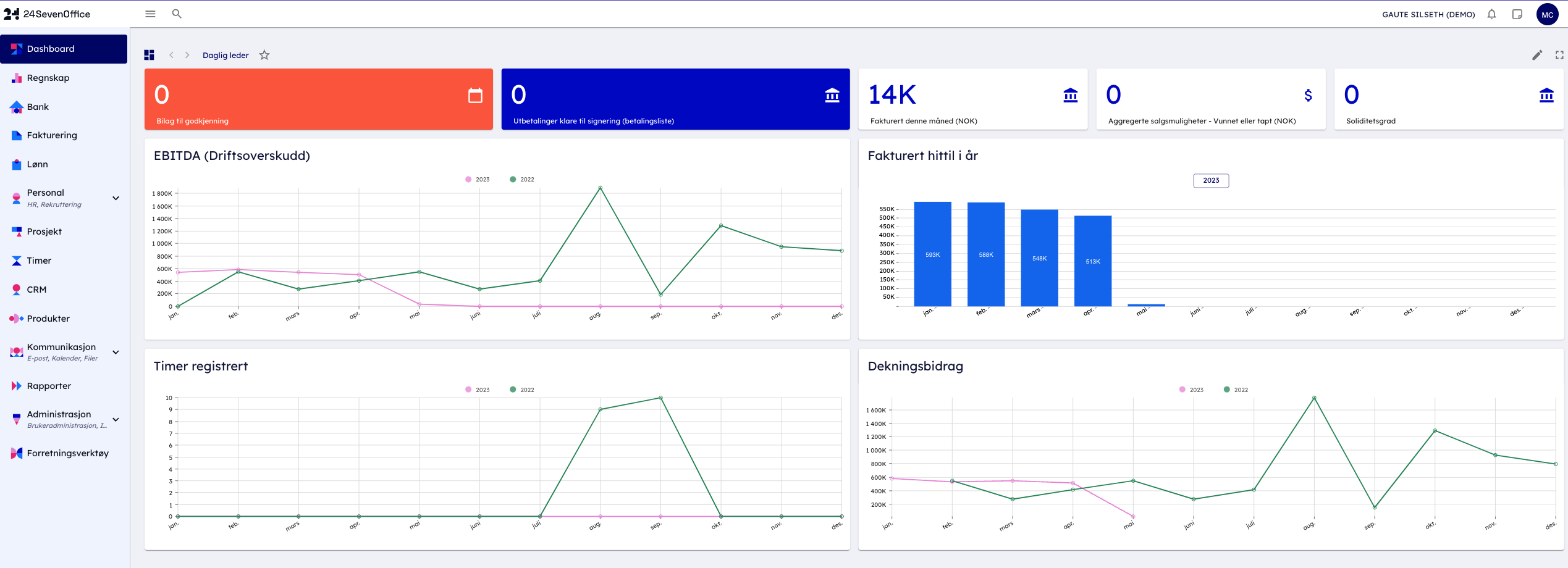En daglig leder ønsker gjerne effektivt å skape seg en totaloversikt over nøkkeltall i virksomheten. I dashboardet under finner du blant annet oversikt over: Fakturerbare timer, vunnede salgsmuligheter, resultat, EBITDA, banksaldo og bilag til godkjenning.