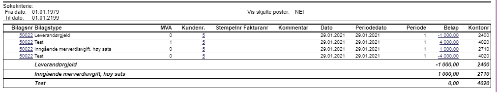 - Effekten av dette vil være en ren bokføring mot MVA konto og 2400, hjelpekonto vil være i 0.