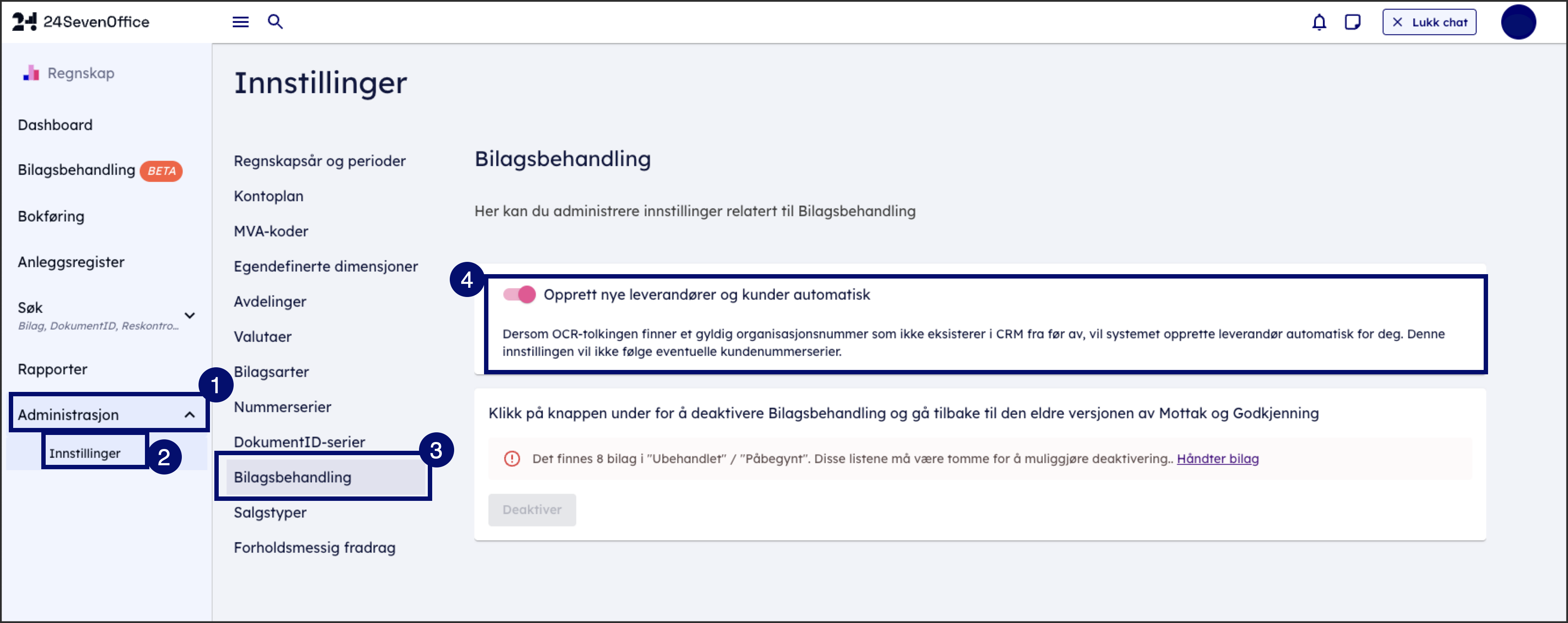 Når du aktiverer bilagsbehandlingen, aktiveres det automatisk funksjonen Opprett nye leverandører og kunder automatisk. Systemet oppretter automatisk nye leverandører når du mottar fakturaer eller andre bilag fra leverandører som ikke allerede er registrert i CRM. Dette skjer gjennom en maskinell prosess: