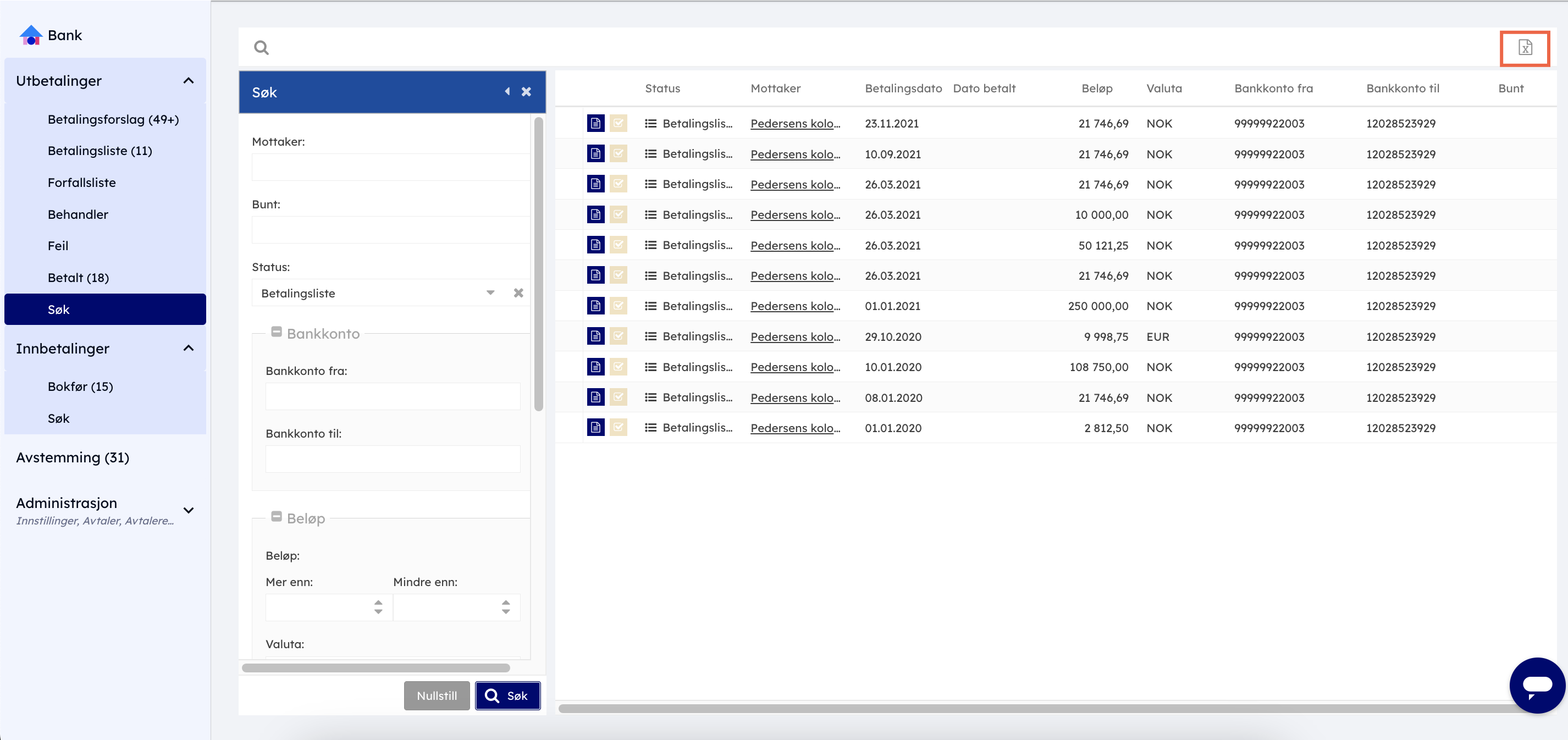 I bankmodulen gå til Utbetalinger > Søk. Der kan du enten velge alle, eller filtrere i søkefilterne på listen som kommer opp. Når du har filtrert, trykk på søk nede til venstre.