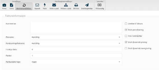Start med å gå til fakturering - innstillinger - abonnementsfaktura. Her setter du innstillinger som gjelder alle nye abonnementsfaktura som opprettes.