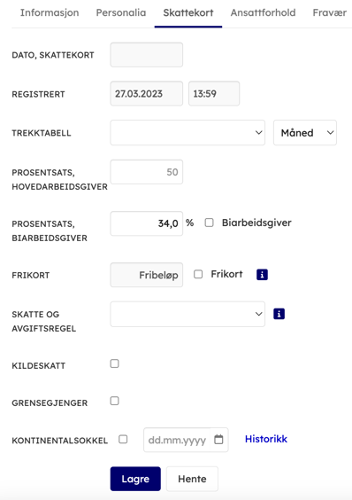 - Fyll inn nødvendig informasjon under Personalia. Dette er en oversikt over opplysninger registrert på den ansatte.