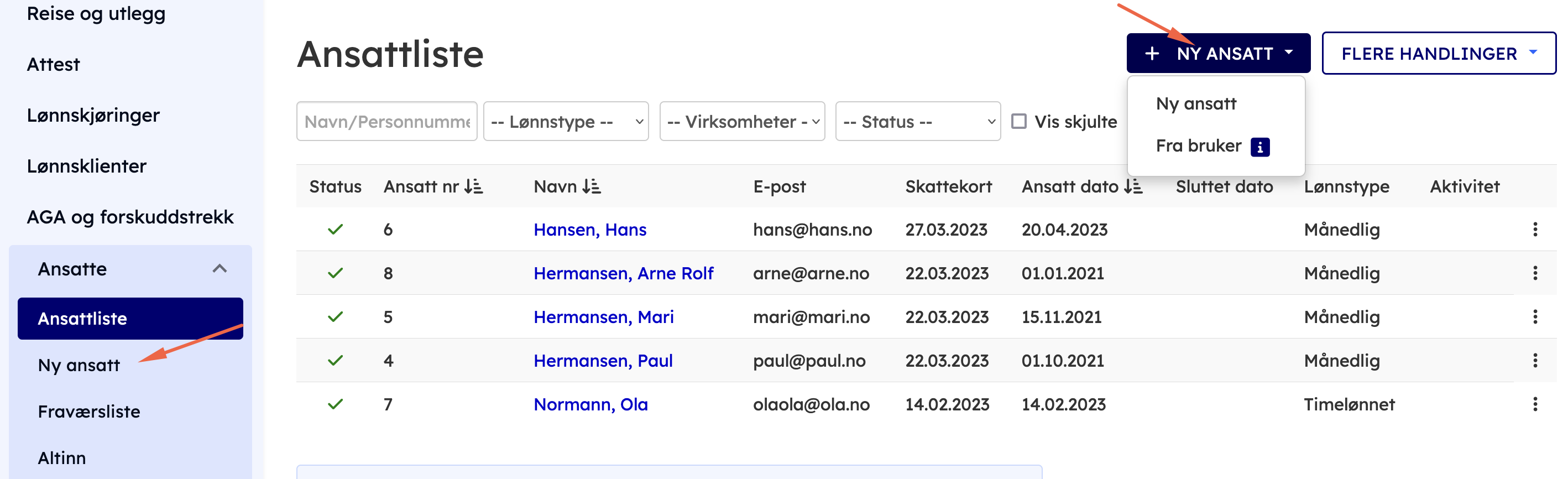 - Trykk enten på Ny ansatt i venstremenyen eller + Ny ansatt til høyre på siden. Velger du + Ny ansatt kan du oprette en helt ny ansatt eller velge å opprette en ansatt med utgangspunkt i en bruker som allerede ligger inne i lønnsmodulen.