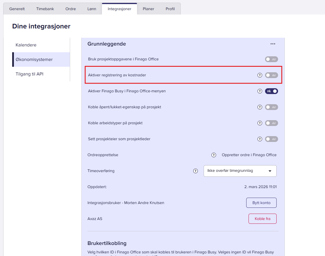 Gå til Innstillinger → Integrasjoner → Finago Office, og aktiver valget «Aktiver registrering av kostnader». Når dette er slått på, vil produktet vises på arbeidstypen i Busy (typisk under timebanktype), slik at man kan verifisere hvilken produktkobling som brukes mot Finago Office.
