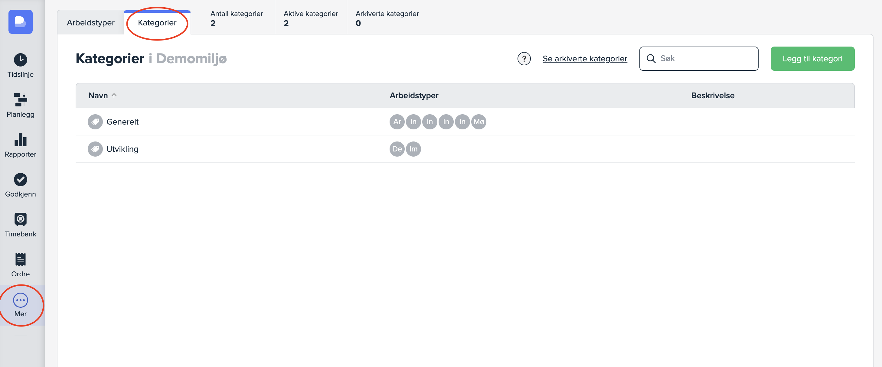 Inne på «Mer» → «Arbeidstyper» vil du finne en fane som heter «Kategorier».